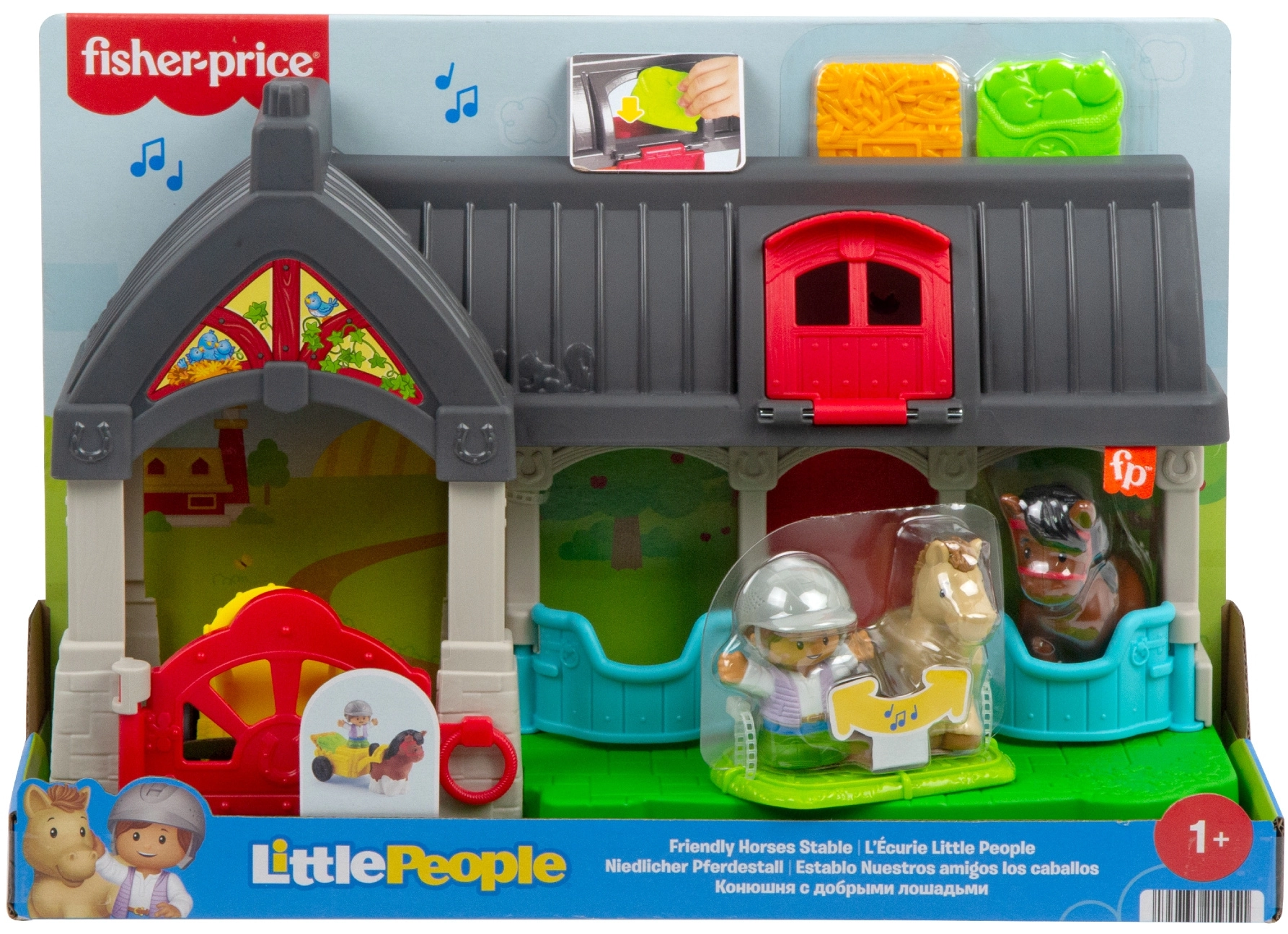 The cheerful Little People stable brings the world of animals to kids’ fingertips. Two separate sections to explore, opening stall doors, and a special “feeding” slot turn every play session into a new story. Children can harness the larger horse to the trailer cart, transport “hay,” and care for their horses with help from the caretaker figure.