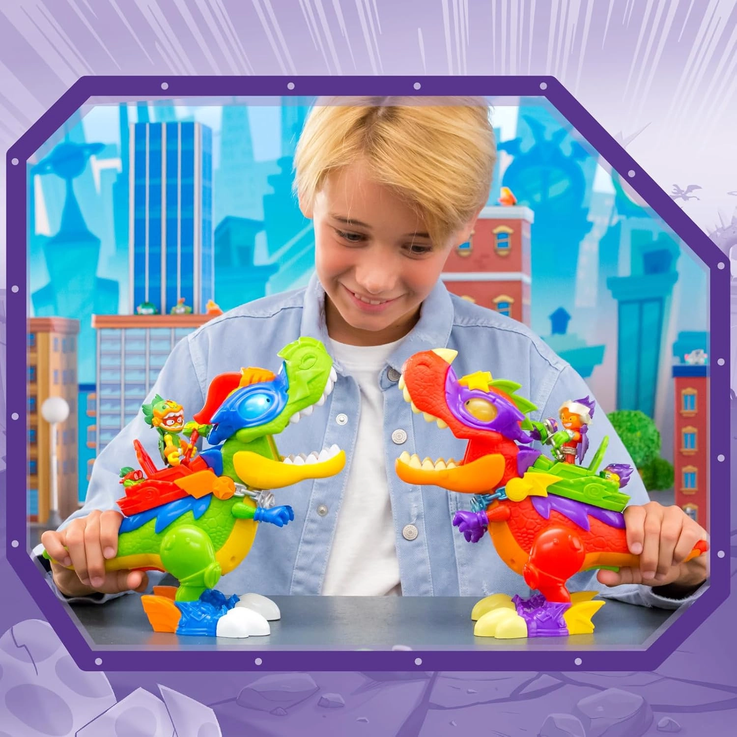 Discover the action-packed SuperThings set with the mighty V‑Rex dinobot, featuring light and sound effects, articulated joints and a biting jaw attack for thrilling battles in Kaboom City. Includes exclusive figures of a SuperThing villain and a Kazoom Kid, so the fun starts right out of the box.