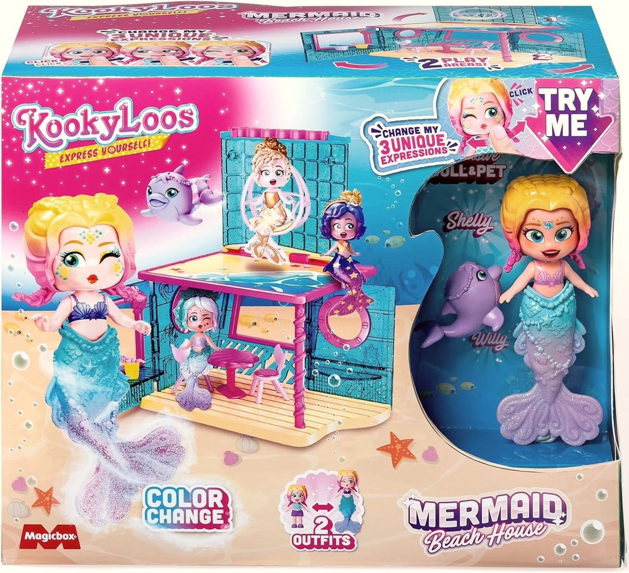 Discover the magical world of KookyLoos with the Shelly figure and her beach house for mermaids. This playful set features color-changing in water, 3 facial expressions at one click, and lots of fashion accessories for creative mix & match. An ideal gift for kids who love imagination, collecting, and style.
