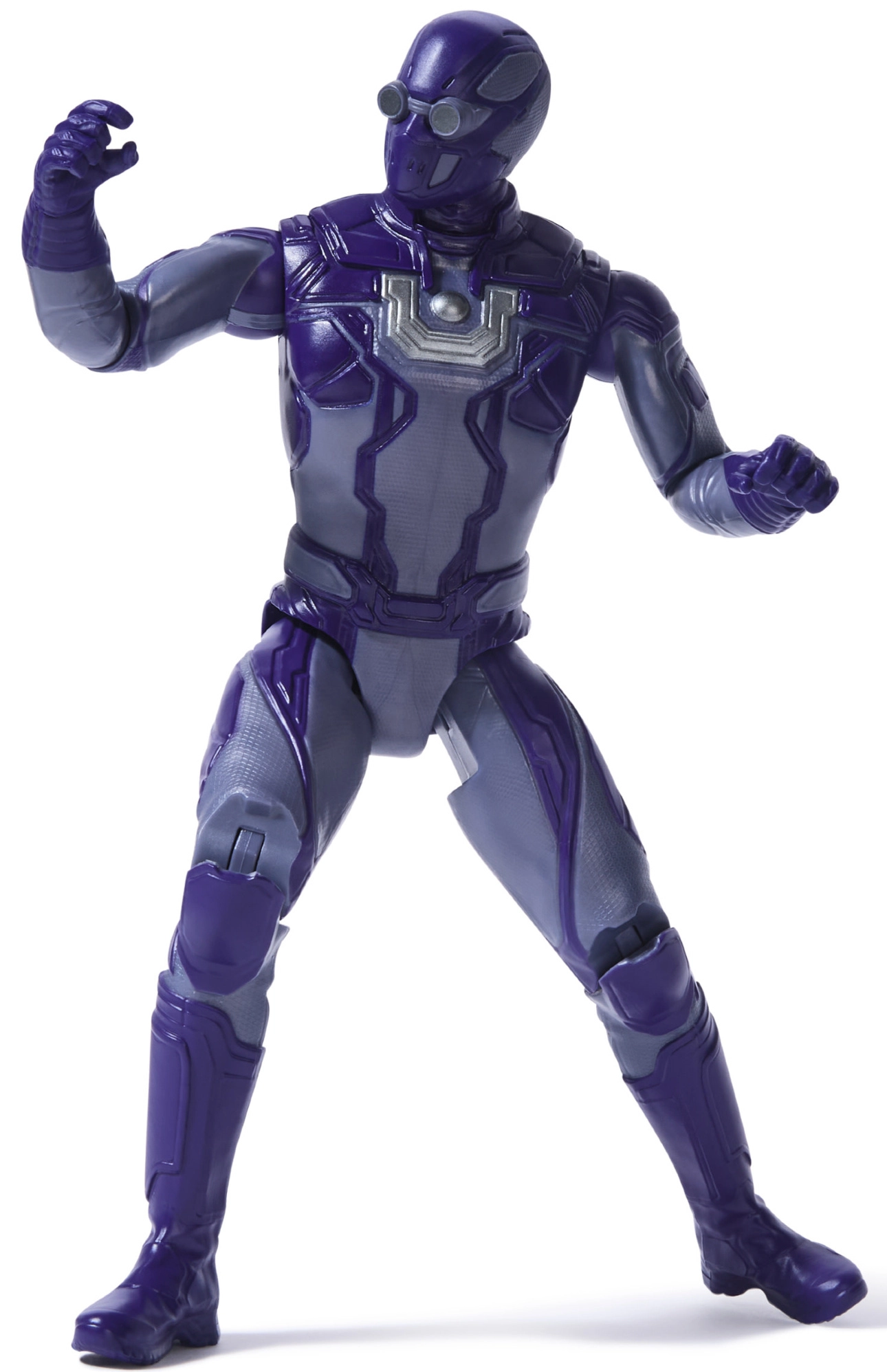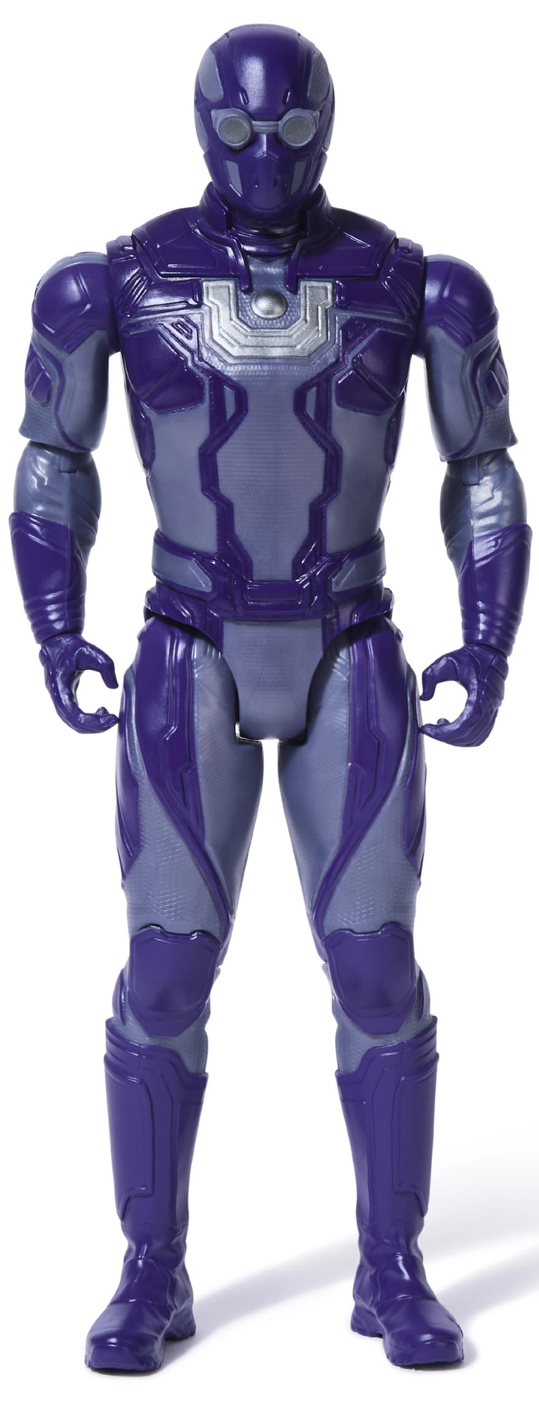 Purple armor, helmet with “goggles,” “U” emblem on chest