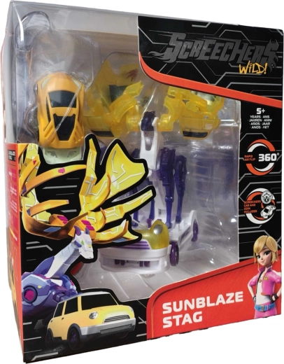The Screechers Wild! set by Alpha Group brings the character Sunblaze Stag, which transforms in an instant from a tough stag into a nimble yellow vehicle. The energy coin activates automatic transformation, adding tension and speed to play—perfect for battles in the futuristic Zephyr City.