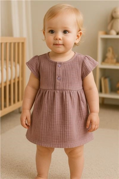 The New Baby muslin dress in a soft lavender shade is a great choice for warm days. Thanks to the A-line cut and gathered skirt, it looks adorable while allowing freedom of movement. The front fastening makes quick changes easy and stress-free.