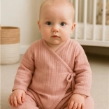 Discover the comfort of the New Baby muslin overall in a gentle pink shade. Thanks to the wrap design, it’s quick to put on without pulling over the head. Practical side fastening with ties, complemented by an inner snap, keeps the overall in place. Snaps between the legs make diaper changes noticeably easier at home and on the go.