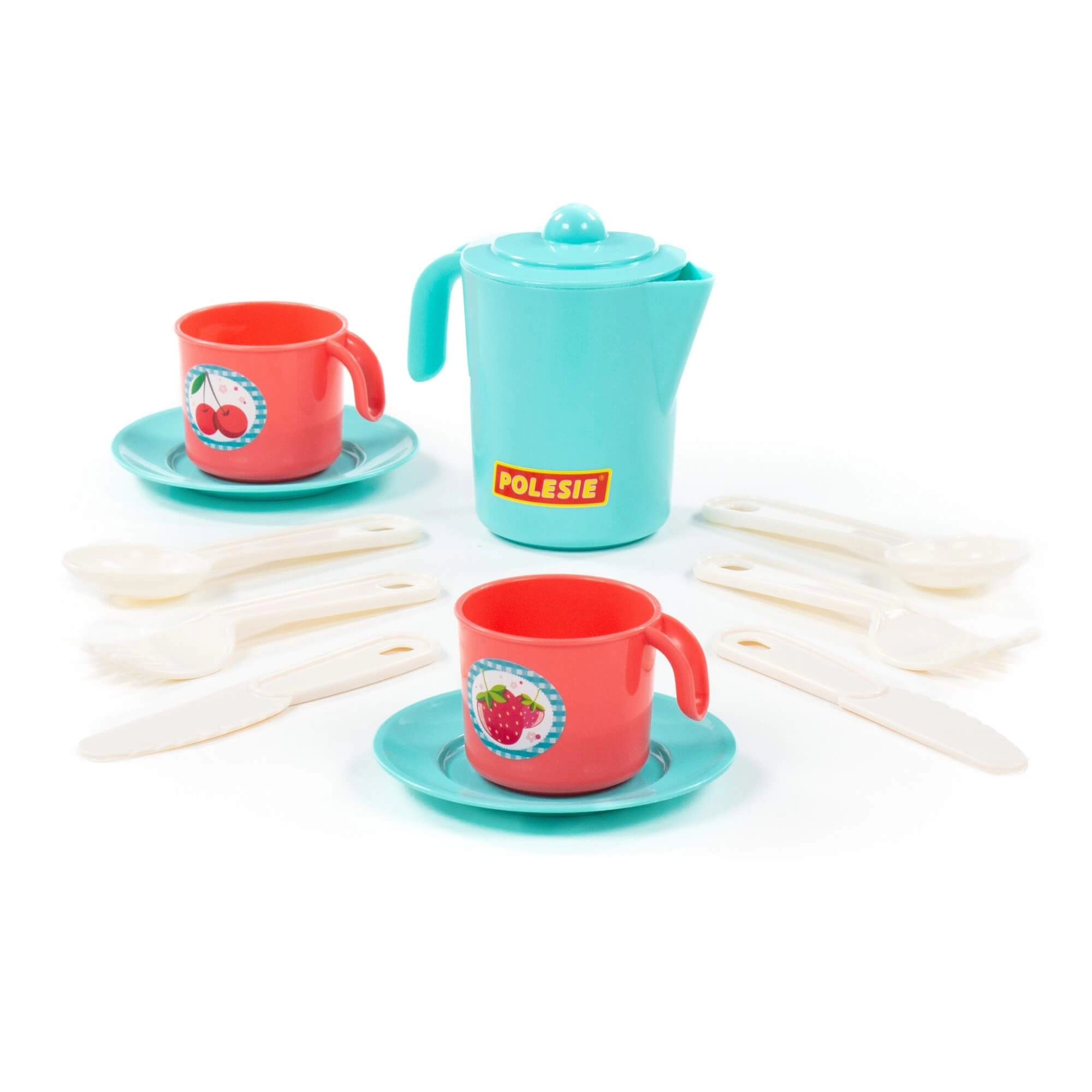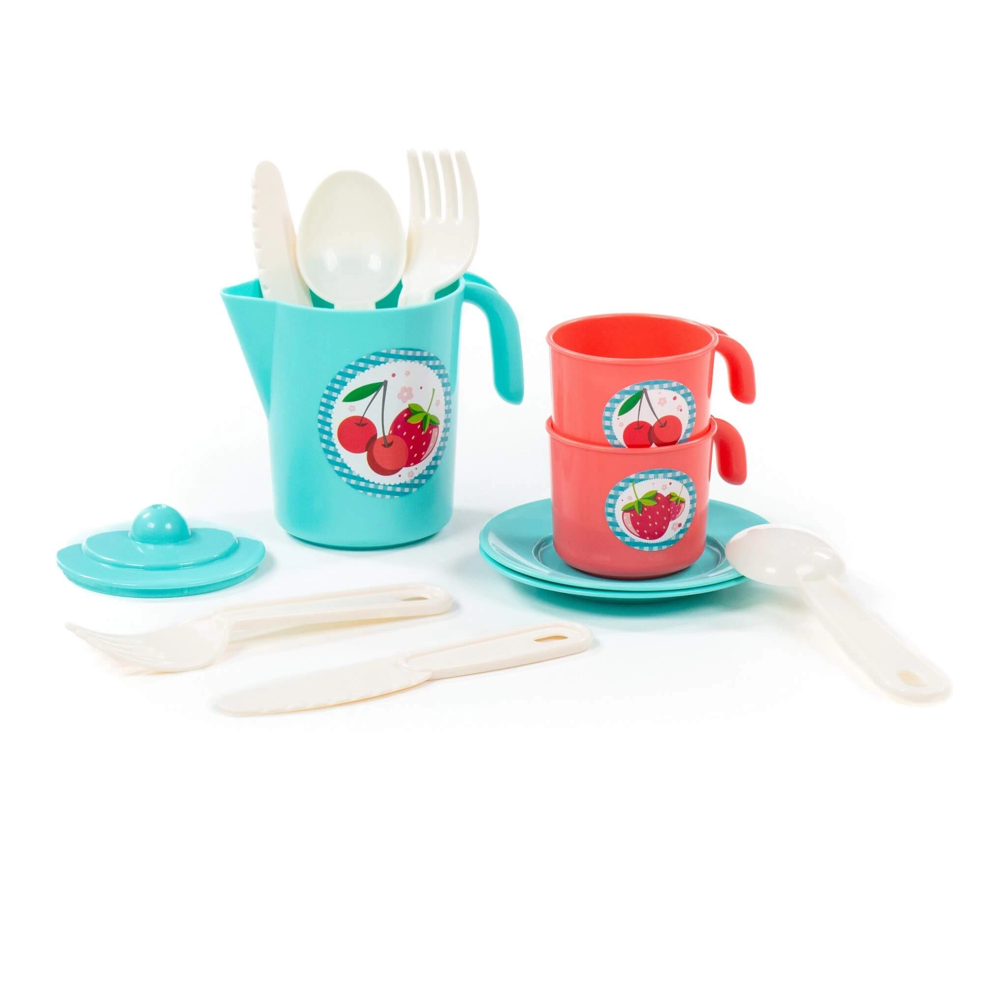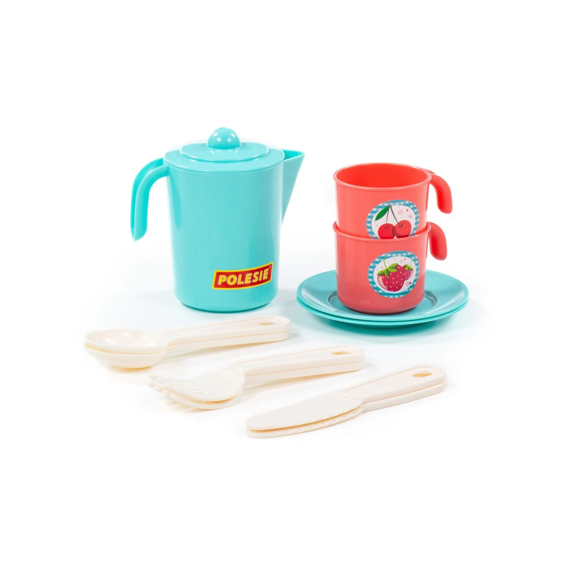 The set includes a teapot with lid, 2 cups with handles, plates/saucers, and plastic cutlery. Thanks to the safe, smooth edges and low weight, the dishes are easy to handle. Compact dimensions of approx. 130 × 105 × 121 mm make storage and carrying simple.