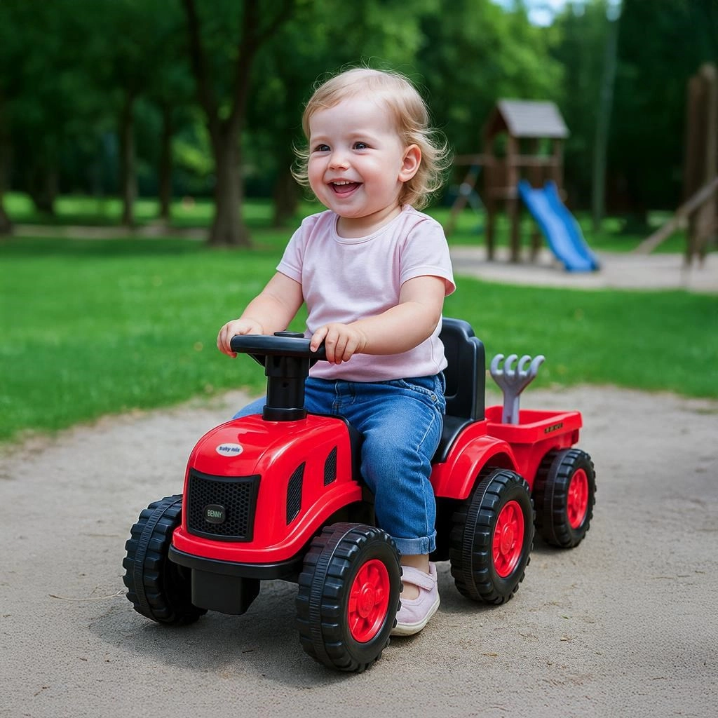 A fun and safe tractor for little farmers: the Baby Mix Benny ride-on with a detachable trailer and tools offers hours of active play indoors and outdoors. Thanks to the anti-slip wheels, comfortable seat, and horn, kids enjoy a realistic ride, while the lightweight construction and 25 kg capacity ensure comfort and stability.