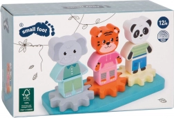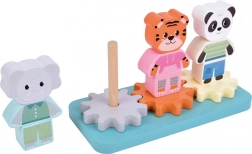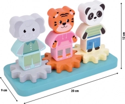 Three cute figures—elephant, tiger, and panda—are made of colorful, stackable pieces that kids can sort, combine, and build up. A clever system of gears connects all figures: turning one makes them all spin, so children instantly see cause and effect.
