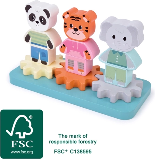 Discover a playful wooden toy with animal friends elephant, tiger, and panda that combines stacking with gears to teach cause and effect. The parts are sturdy, easy to grasp, and safe for little hands. The toy supports fine motor skills, hand–eye coordination, and creative thinking, is made from 100% FSC wood, and colored with non-toxic paints.