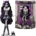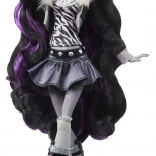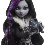 The stylish collectible doll MONSTER HIGH Clawdeen Wolf from the Reel Drama edition pays tribute to black-and-white horror films and the series’ iconic style. She measures approximately 26 cm, features a fully articulated body for creative posing, and striking black-and-purple hair. An elegant retro outfit, stand, and a cute pet are included—perfect for play and display.