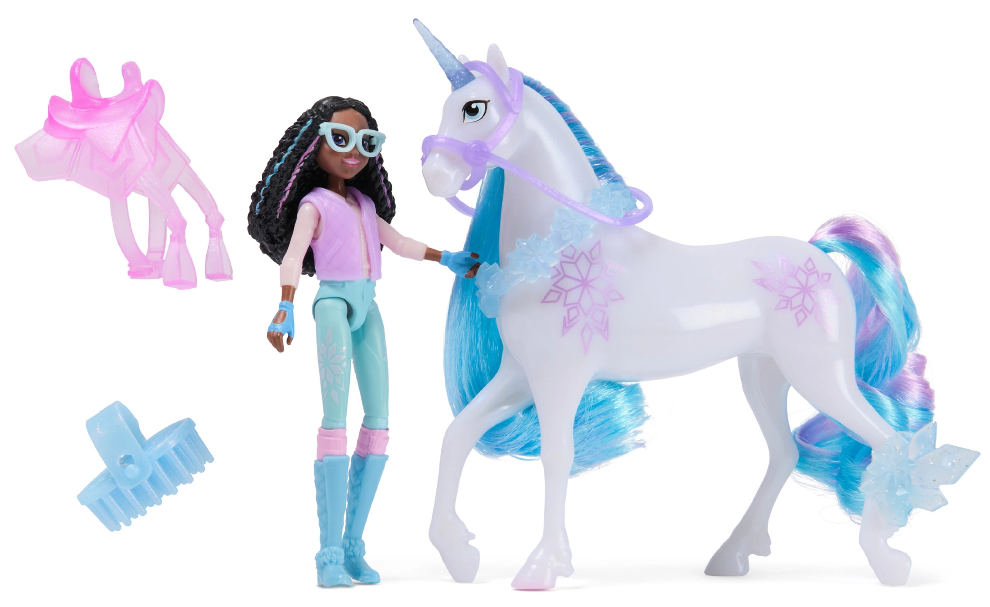 Transport kids to the magical world of UNICORN ACADEMY with the adorable Layla & Glacier set. The teen heroine figure with poseable limbs and her loyal unicorn with a thick mane and tail invite creative storytelling. A mane-grooming brush is included for endless styling fun. An ideal gift for young fans of magic, friendship, and adventure.