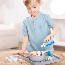 The Simmer & Stir set is designed to give kids a realistic cooking experience while supporting everyday skills. Thanks to the color-changing foods (from “frozen” to “cooked”), kids immediately see what happens after pouring water from the bottle or scooping and stirring with the spoon.