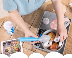 The tray with a pretend cooktop, pot, and stirring spoon creates a realistic environment for chef role-play. Kids can mix, pour, and serve just like in a real kitchen.