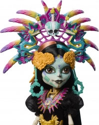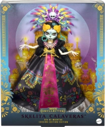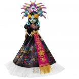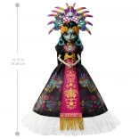The Monster High Skullector edition pays homage to the Mexican holiday Día de Muertos. Skelita Calaveras enchants with a long black satin-finish dress featuring colorful prints and a bold magenta sash with gold fringe. A statement feathered headpiece, striking jewelry, and detailed face paint make her a remarkable piece for fans of design and culture.