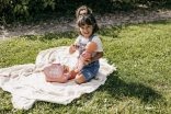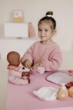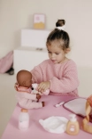 The set includes everything for everyday play and imitating real care: a milk bottle, thermometer, syrup with spoon, shampoo dispenser, bib, and a doll diaper. The set develops creativity, fine motor skills, and teaches responsibility and gentle care.