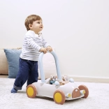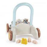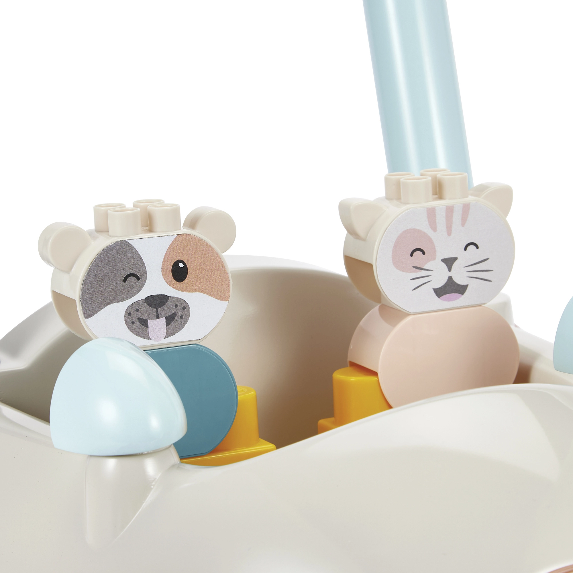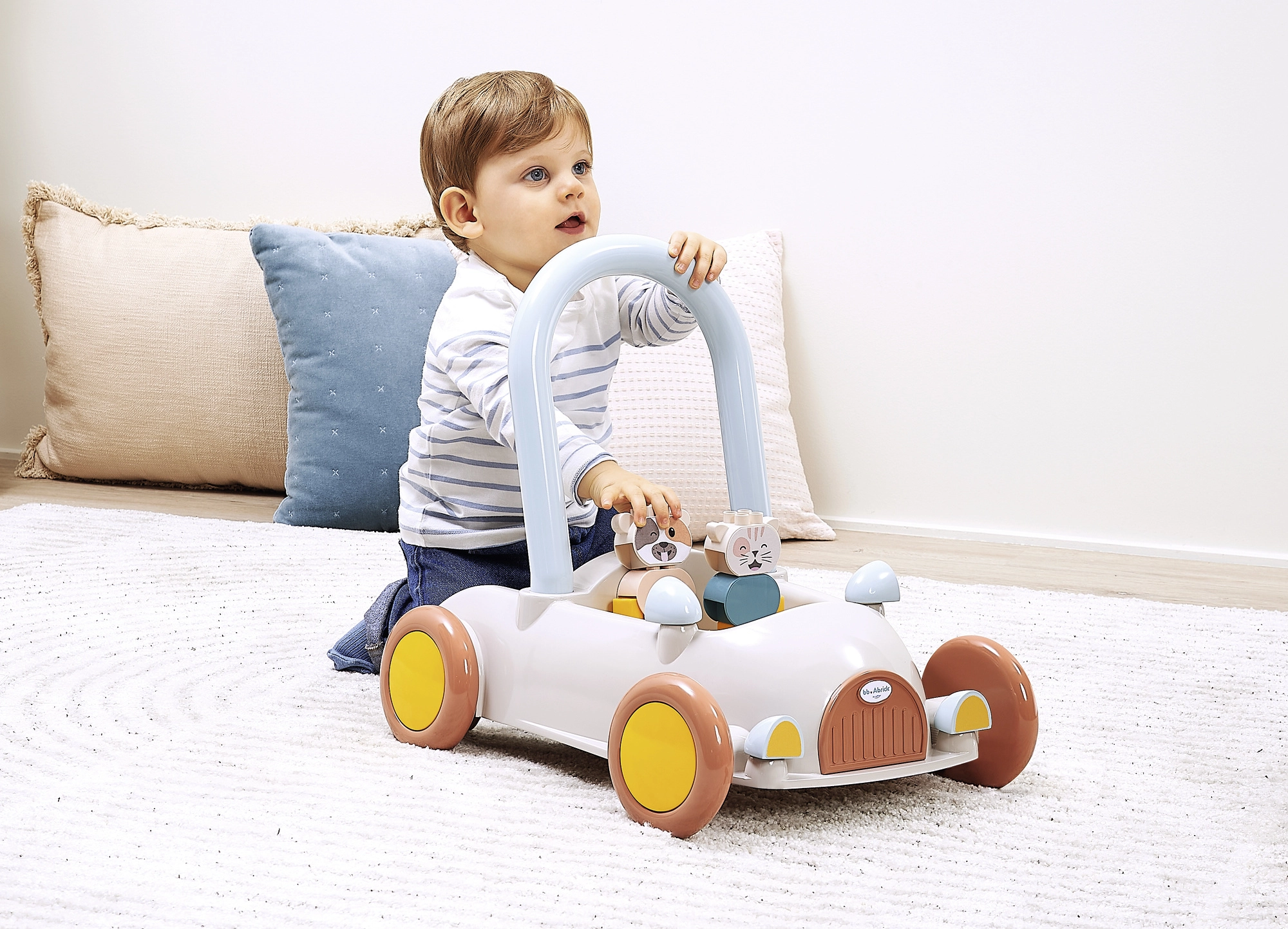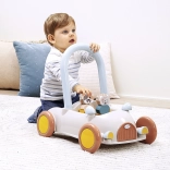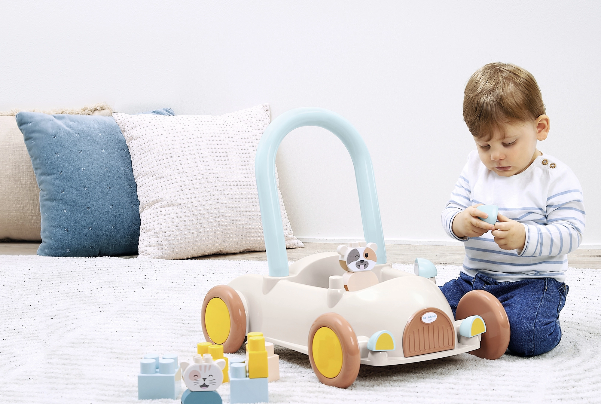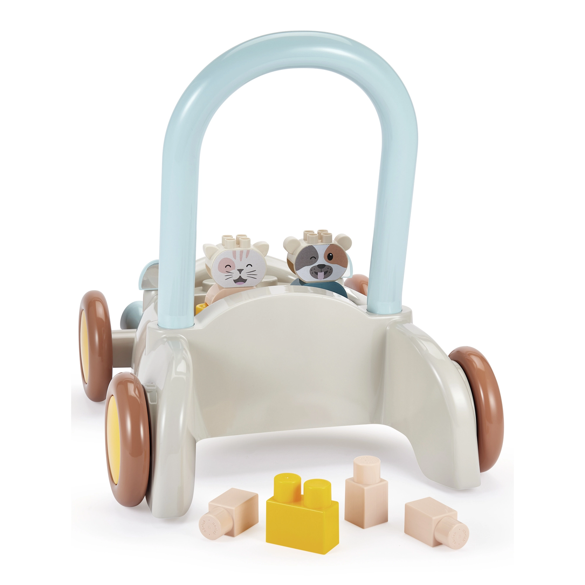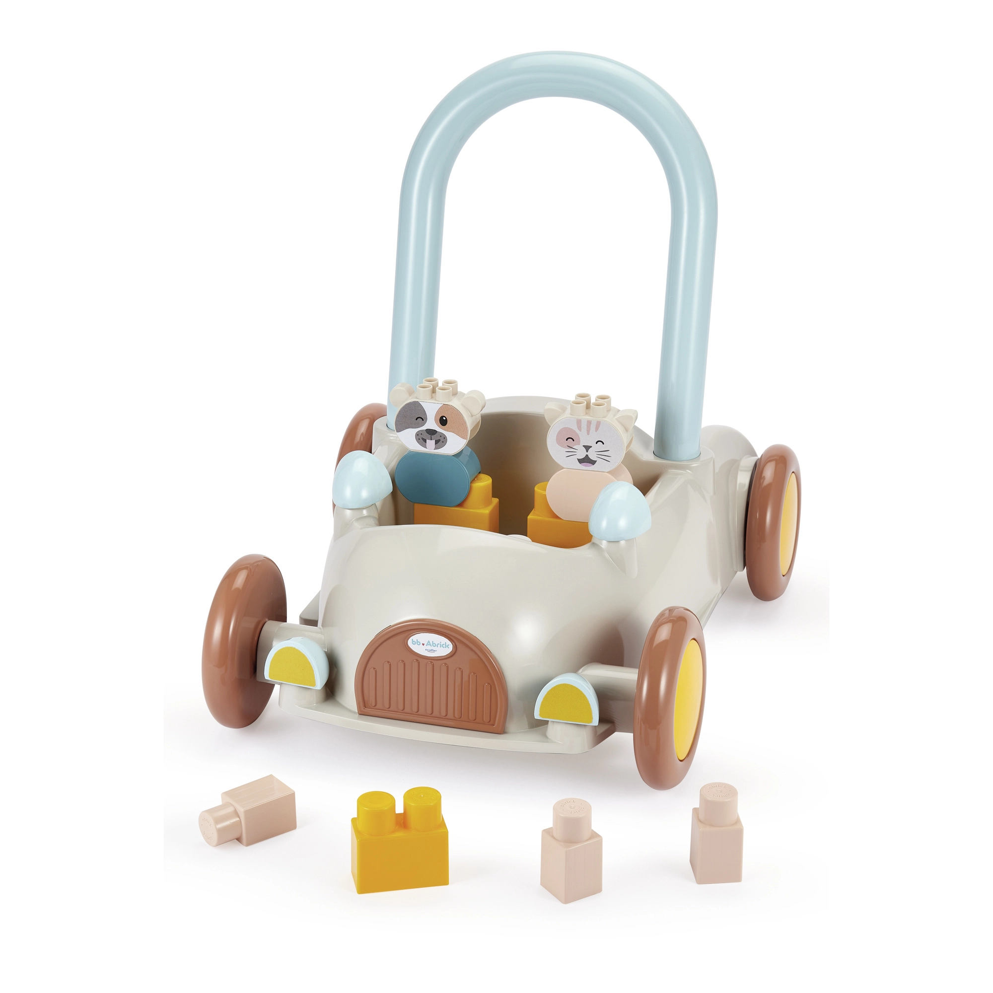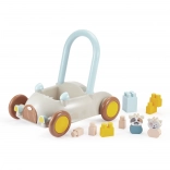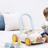 Discover a multifunctional push car with blocks that helps little ones with their first steps while keeping them engaged with stacking. The car has a practical handle for pushing or pulling, wide wheels for confident movement, and interior space for the blocks. It includes approximately 16 building pieces and two cute figures, a kitten and a cow, to foster imagination and themed play.
