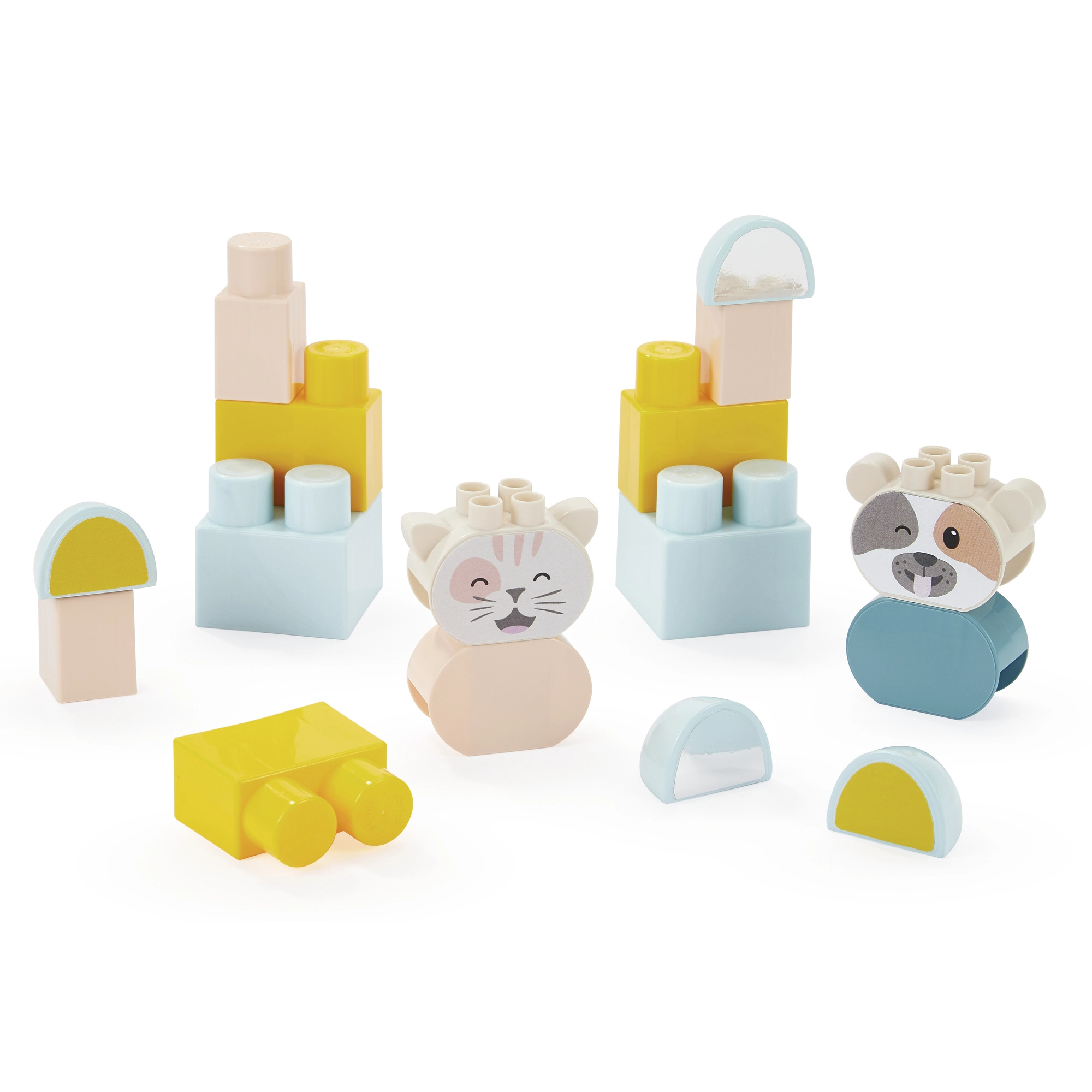 The set includes approximately 16 blocks and two figures: a kitten and a cow. Large, rounded pieces are ideal for small hands and encourage creative building.