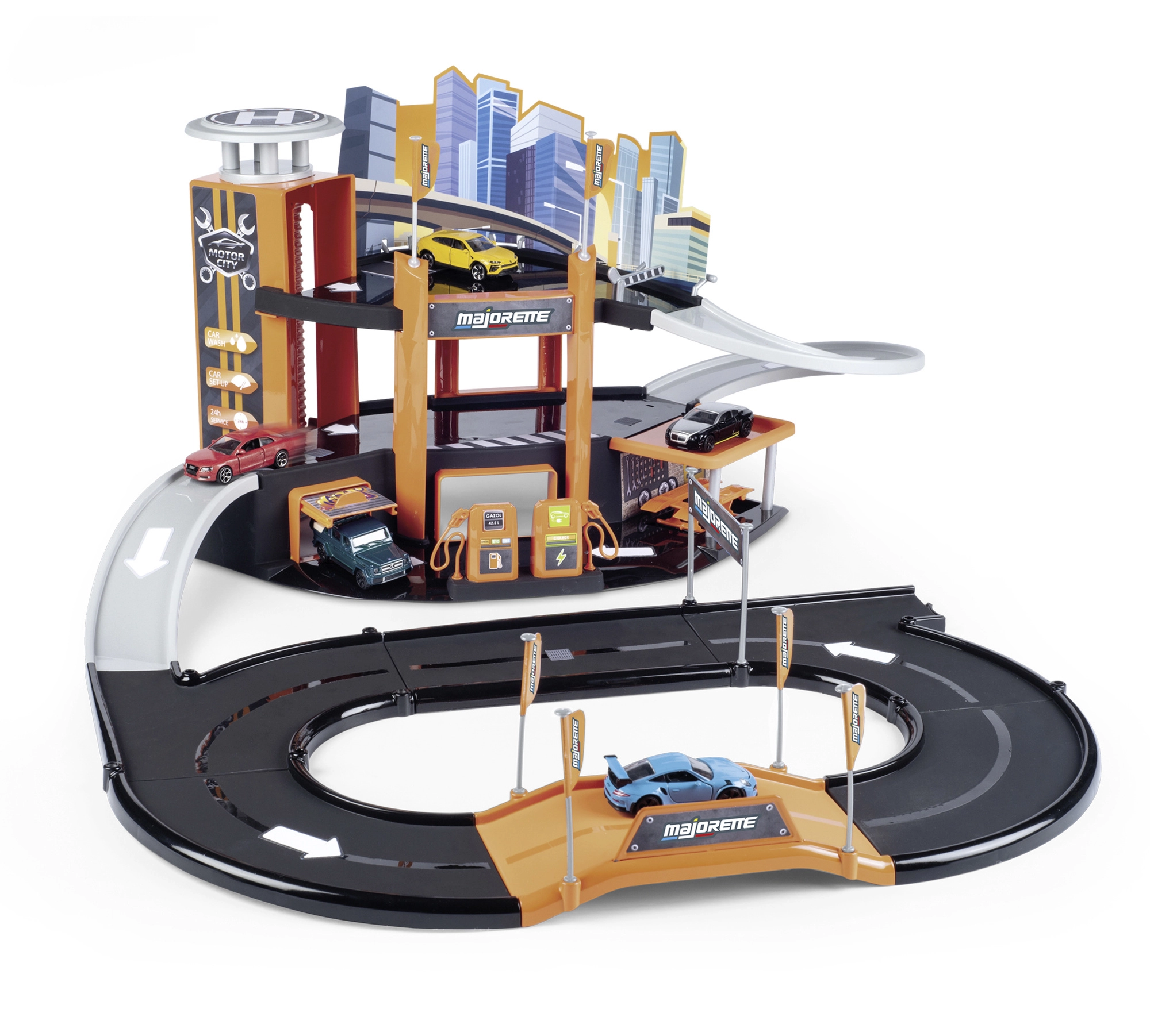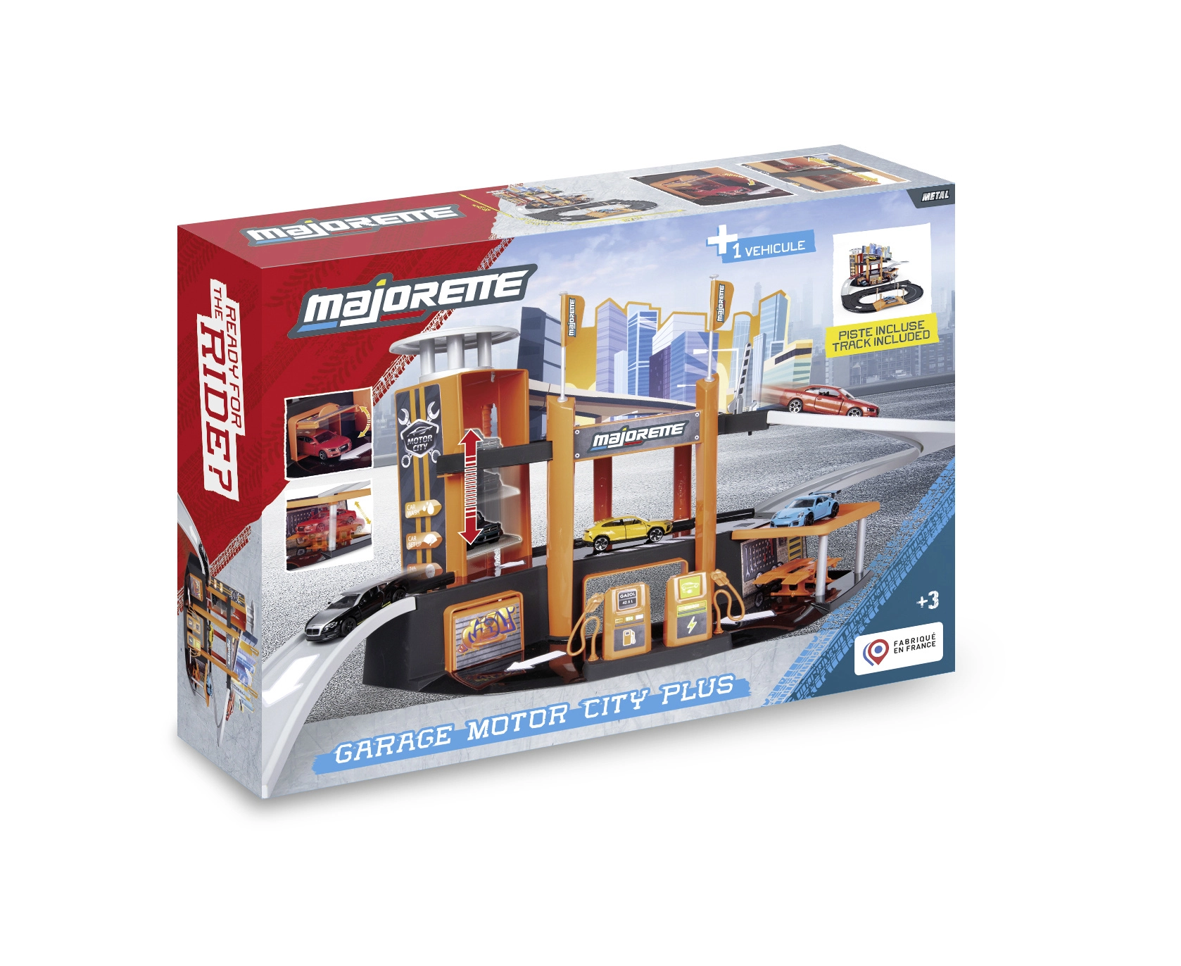 Discover maximum fun with the Motor City Plus garage set by MAJORETTE – a 3-level parking garage with a long ramp, loop, elevator, service area, and a gas station featuring an “charging” option for electric cars. A city car is included for instant play.