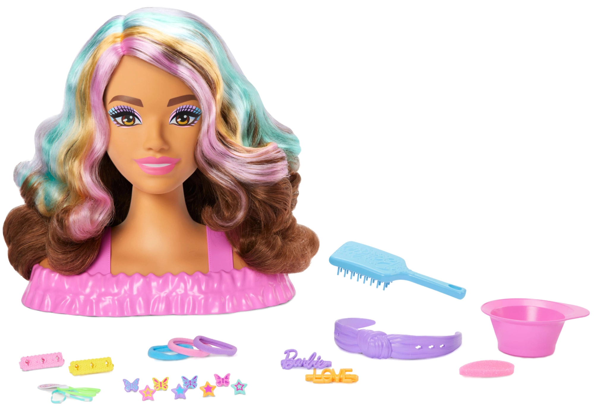The BARBIE styling head brings kids endless hairstyle possibilities. Long brown hair with pink, orange, and turquoise streaks holds its shape well and invites braiding, pinning, and decorating. Add a touch of magic with clips and lips that change color when using water and the sponge.