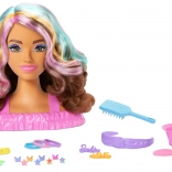 Become a little hairstylist with the BARBIE styling head and a rich set of accessories. Long brown hair with pastel streaks invites you to create braids, buns, and ponytails. The set includes clips and hair ties, a brush, a headband, and fun color-change effects on the clips and lips using the sponge. Ideal for creative play and developing fine motor skills.