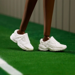 The white athletic set with visor and sneakers stands out in play and on display, complemented by jewelry for an iconic look.