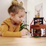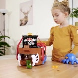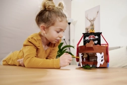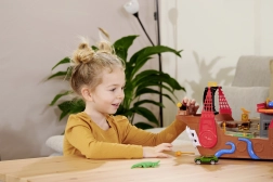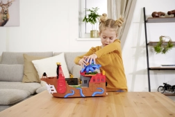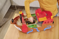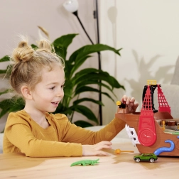 This finely detailed pirate ship is a true entertainment hub. Lift the deck to reveal a built-in track for the metal car, where levers and switches let you decide whether the vehicle shoots through the skeleton gate, ends up in jail, or gets catapulted from the raft. A working cannon, treasure chest, barrels, crocodile, and other accessories encourage imaginative play.