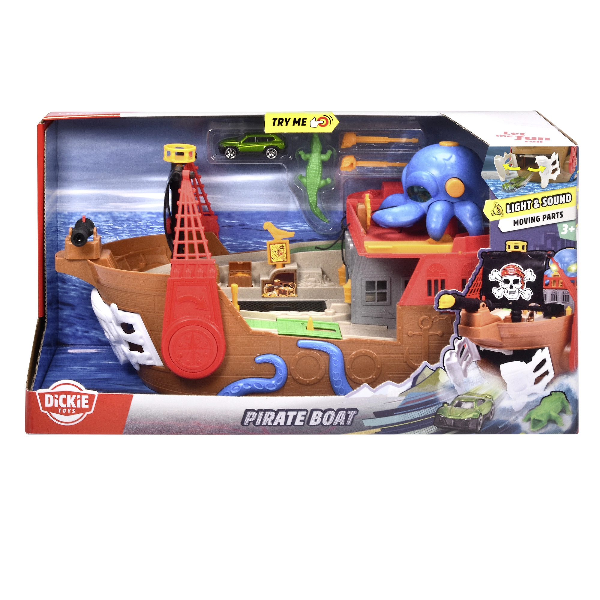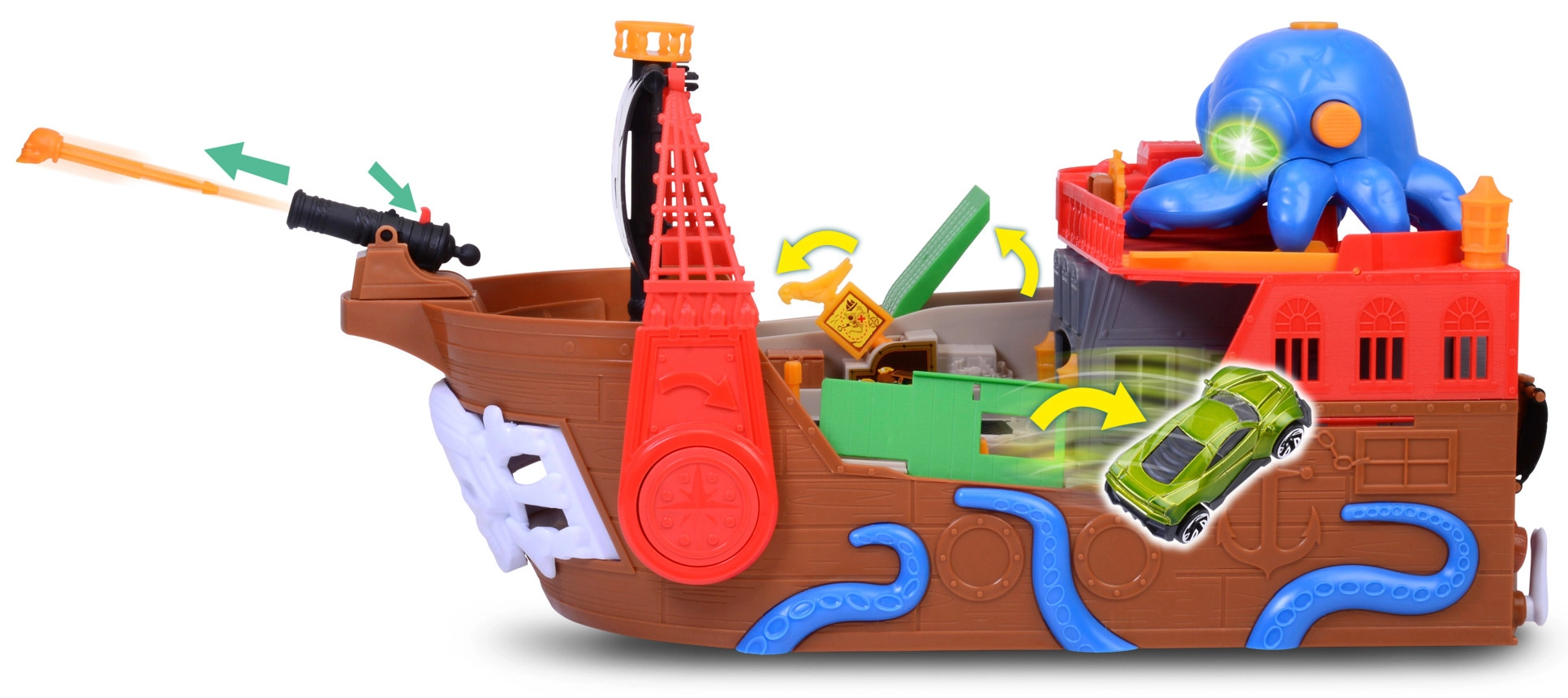 The detachable octopus lights up and makes sounds. Its tentacles grab the car or accessories to add pirate tension to every story.