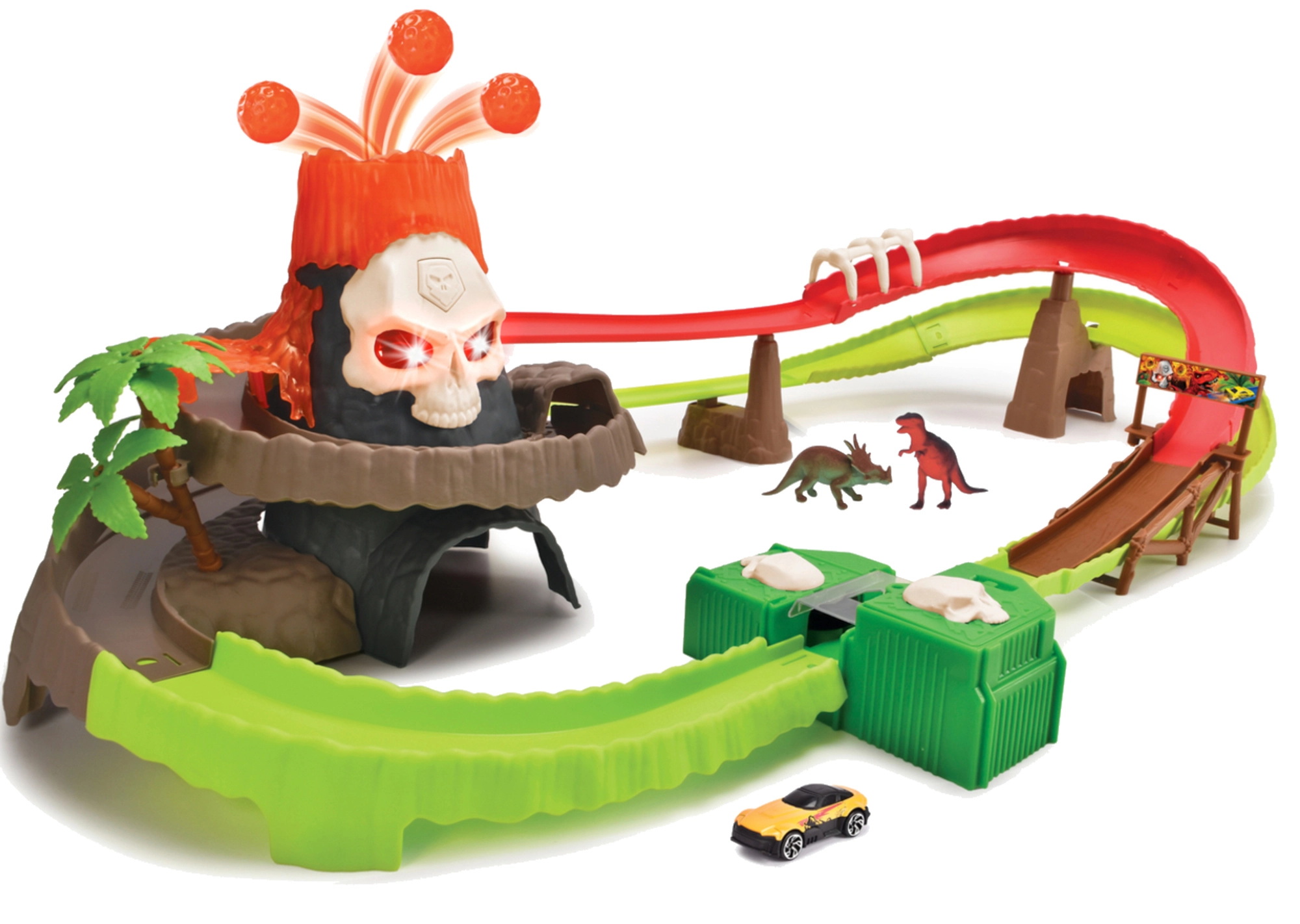- Skull Volcano track, 1:64 die-cast car, automatic launcher ramp, interactive elements