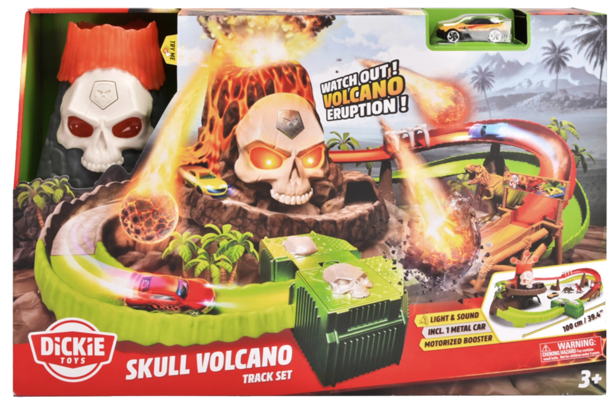 Set off on a thrilling ride with the Skull Volcano track from Dickie Toys. Kids trigger a volcano eruption by racing through the loop, enjoy light and sound effects, and with the automatic launcher ramp and 1:64 die-cast car they’ll experience hours of action-packed fun. The set can be expanded with additional tracks for even bigger adventures.