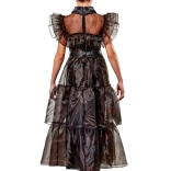 Long sleeves, a high stand-up collar, and a richly gathered multi-layered skirt create a striking effect that stands out at any dance or party. The costume is a great choice for fans of WEDNESDAY and anyone who loves a mysterious, elegant, and gothic style.
