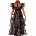 Long black dress with a layered skirt, high collar, and sheer ruffles creates an authentic atmosphere of the beloved heroine.