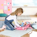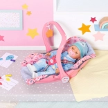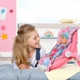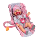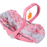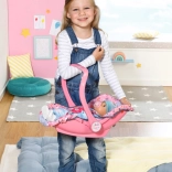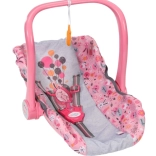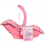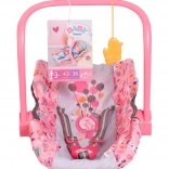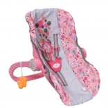 This stylish pink car seat and carrier for BABY born dolls is designed for children aged 3+. With a sturdy plastic shell, soft cover, and safety strap, it provides comfort and support for the doll during transport and rest. The rotating handle lets you quickly switch from carrying to seating or rocking mode.