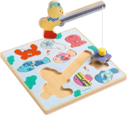 A fun wooden puzzle with a fishing theme for the little ones. Children “catch” the fish using a magnetic rod and place them into the correct shapes. Supports fine motor skills, hand-eye coordination, and patience. The cheerful motif with a kitten and colorful fish will delight every little angler.