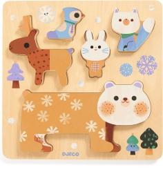 This set combines classic insert wooden puzzles with a balancing tower. The playful animals—bear, rabbit, bird, fawn, and owl—can be inserted into the board by shape or stacked into a tower to test balance. The game helps children develop patience and spatial awareness.