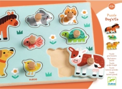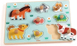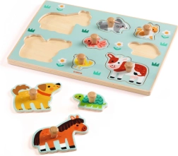 The wooden insert puzzle by DJECO with a farm theme is an ideal first jigsaw for little ones. Children learn to recognize the shapes of individual pieces, animals, and their typical outlines while developing hand–eye coordination and patience.