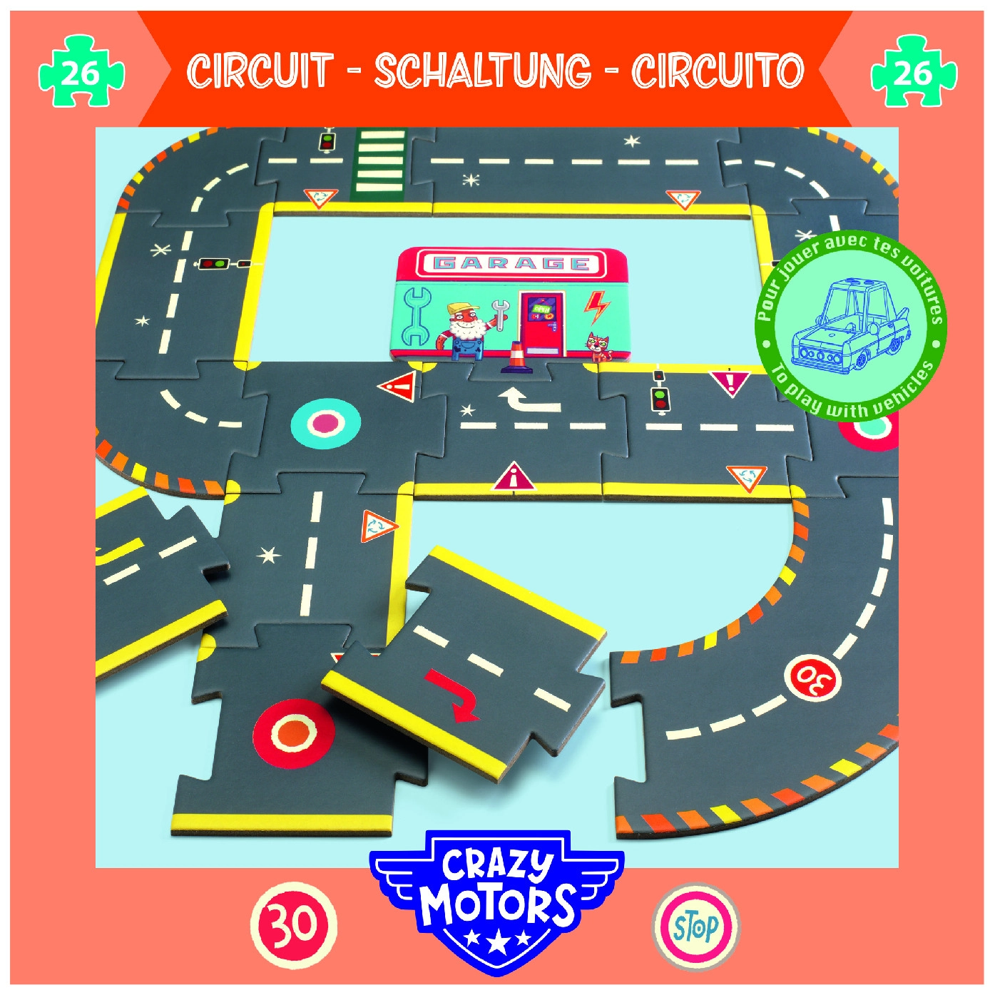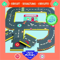 Build a city of speed for kids with the giant CRAZY MOTORS racing track puzzle. Sturdy pieces made from durable material are easy to assemble, creating realistic roads with lanes, traffic lights, signs, parking, and a roundabout. Ideal for toy car play, developing fine motor skills, imagination, and road safety awareness.