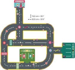 Lane markings, crosswalks, traffic lights, and signs create authentic traffic scenarios that teach kids the rules of the road through play.