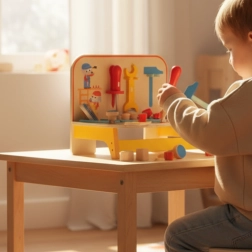 Children practice fine motor skills and coordination by tightening screws, hammering pegs, and assembling pieces. Ideal for first technical steps through play.