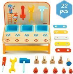 The compact wooden mini workshop by DJeco will delight all little repairers. It offers a rich set of tools, colorful screws and assembly pieces that help children develop fine motor skills, hand–eye coordination, and creativity through play.