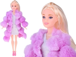 A doll with long blonde hair, a glittery dress, and a soft pink/purple fur coat adds elegance and creativity to play.