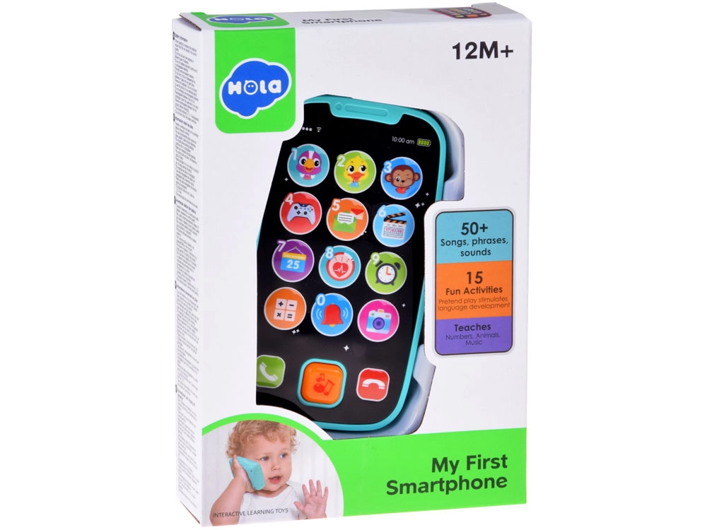 The HOLA Interactive Phone – My First Smartphone – is an ideal toy for pretend play and early learning. Children will love the colorful icons, flashing light, and the wide range of sounds: animals, music, camera, calculator, ringtone, or alarm. The toy supports learning numbers 0–9 in English and develops hand–eye coordination and curiosity.