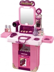 This pink 2-in-1 vanity is ideal for little fashion lovers who enjoy pretend play as a hairdresser or in a beauty salon. The compact suitcase opens into an elegant table with a mirror, shelves, and lots of accessories. The mirror lighting and sound effects add a realistic touch and make play even more fun.