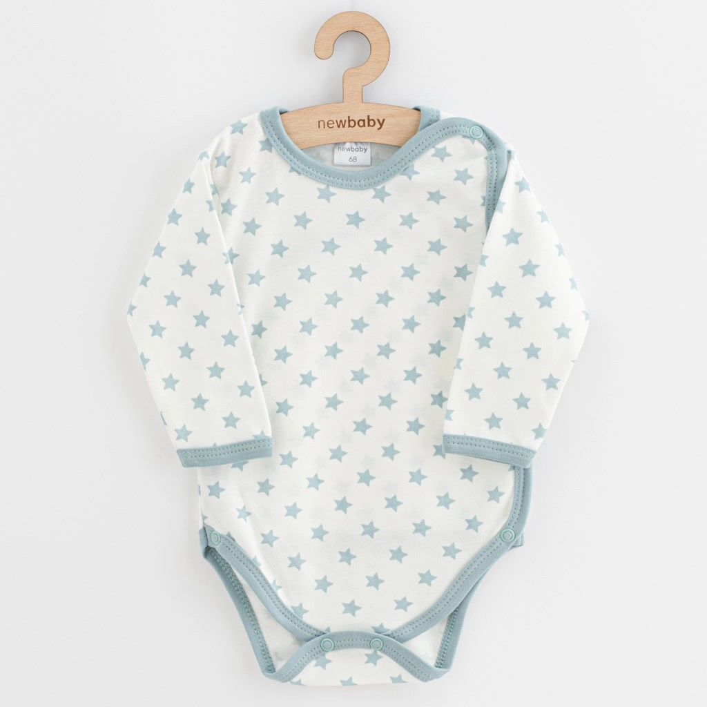 Practical set of three full-snap NEW BABY Classic II bodysuits for girls in mint, dinosaur, and star variants. Thanks to snap fastening along the entire length and between the legs, dressing and changing are quick and easy. Made from 100% soft cotton for maximum comfort for newborns.