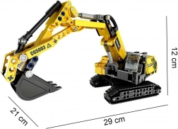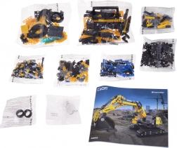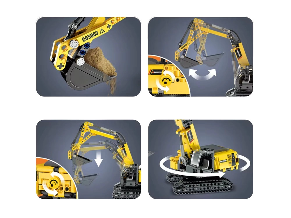 Building is smooth thanks to precisely fitting pieces, and the finished structure is strong and stable. The yellow–gray color scheme and stickers enhance the realistic look. The excavator has a functional arm with lift capability, a movable bucket, a 360° rotating cab, and tracks for smooth movement.