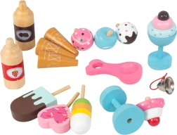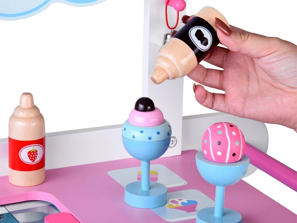 - Rich accessory set: 2 syrup bottles (strawberry, chocolate), 2 cups, 3 scoops, 2 bar scoops, 3 cones, 3 popsicles, 1 ice cream scoop.
