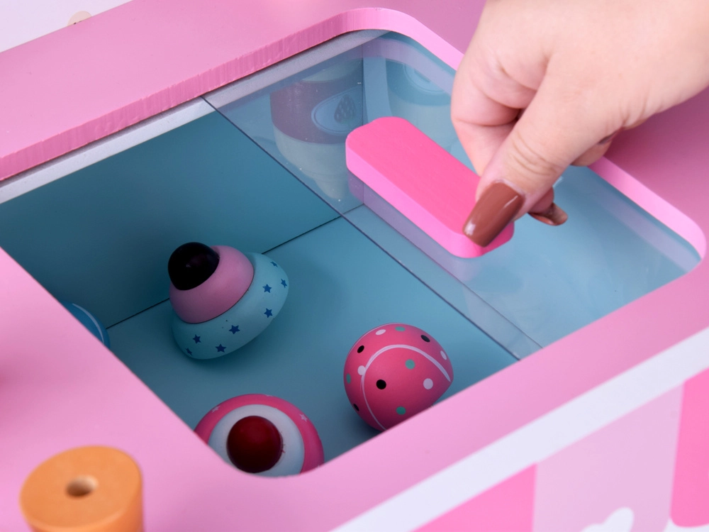 This stylish kids’ ice cream cart in soft pink and blue shades is ideal for shop or ice-cream-parlor pretend play. The top counter serves as a display for scoops, cones, and popsicles; below it you’ll find a large shelf and a sliding “fridge” for storing treats and accessories. Practical two hooks and a silver bell complete the authentic serving experience.