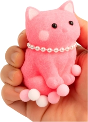 This adorable pink kitten-shaped squishy is a super-soft sensory toy that helps reduce stress, relax, and entertain you anytime during the day. It’s made from a soft, elastic material that feels pleasant to the touch, features a fuzzy surface, and is decorated with a pearl “necklace” and white‑pink pompoms for extra cuteness.