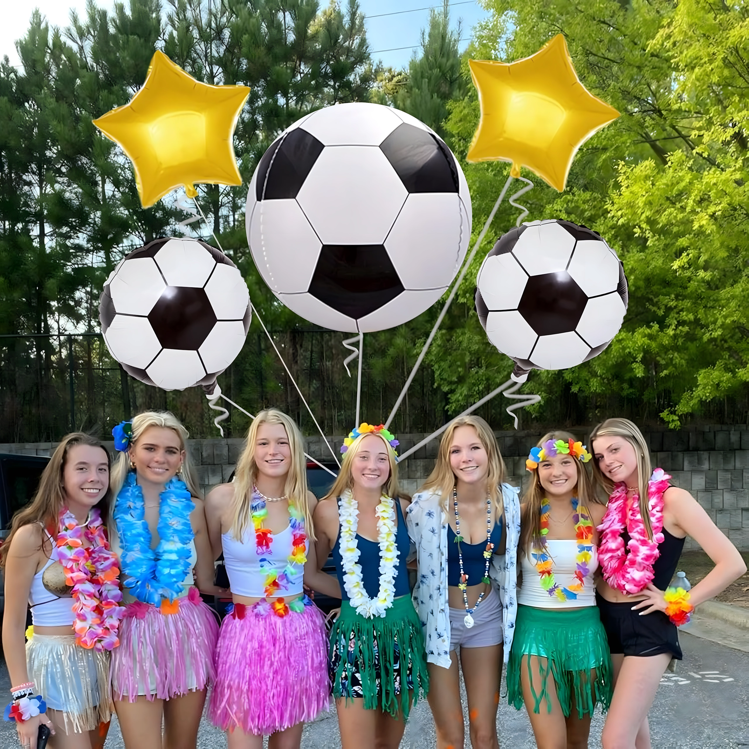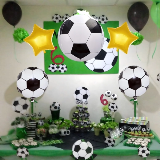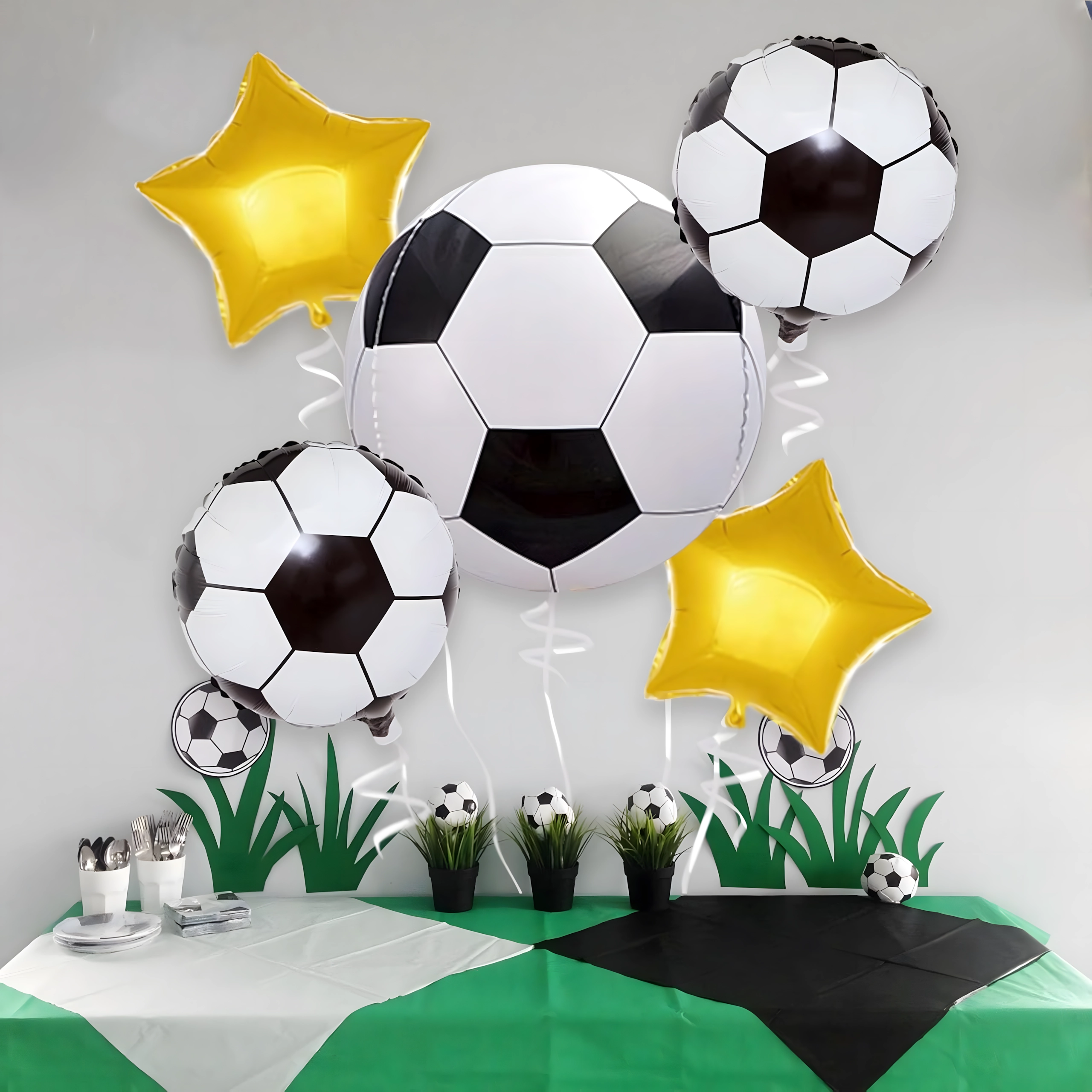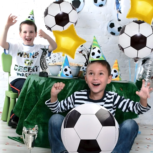 Create an unforgettable birthday atmosphere with this original football-themed balloon set. The combination of realistic football-shaped balloons and elegant gold stars gives your decor a professional look and highlights the football theme.