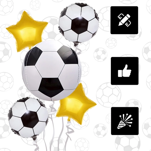 Stylish party decoration for football fans of all ages. This set includes 5 balloons: 1 large foil ball approx. 56 cm, 2 foil balloons in the shape of a football approx. 46 cm, and 2 gold stars approx. 46 cm. Ideal for birthday decorations, football parties, and themed events.