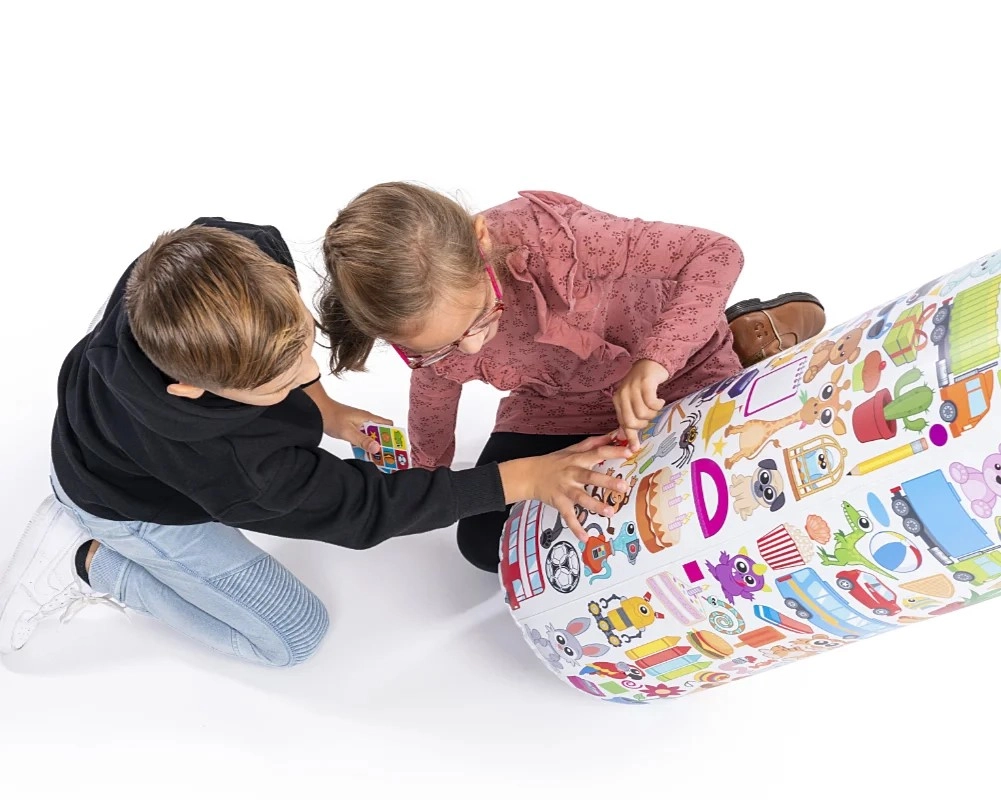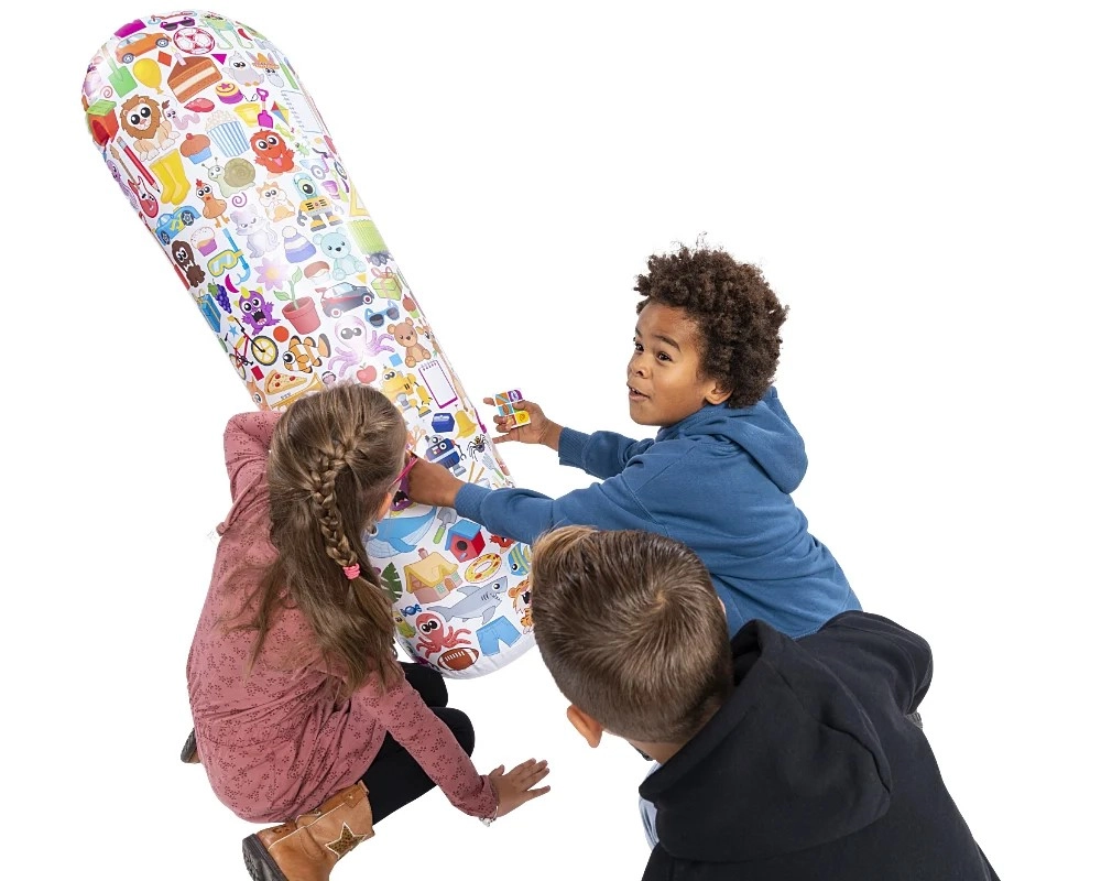 The star of the game is a soft, water-weighted “kiwak” with dozens of colorful icons. Durable, safe, and perfect for energetic play without worry about bumps.