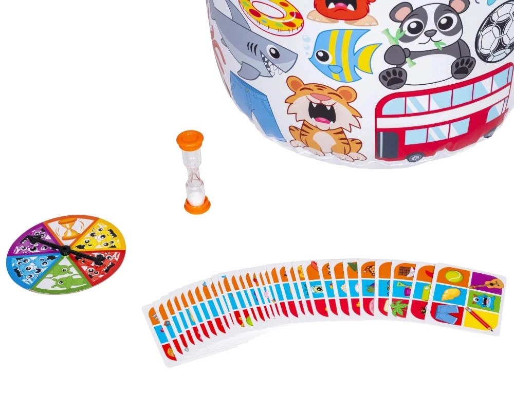 The game Nie daj się wykiwać brings dynamic action where quick reflexes, focus, and team fun decide the outcome. The main element is a large inflatable “kiwak” with colorful icons – based on the drawn card, players quickly find and mark the matching picture. The first to collect three cards wins.
