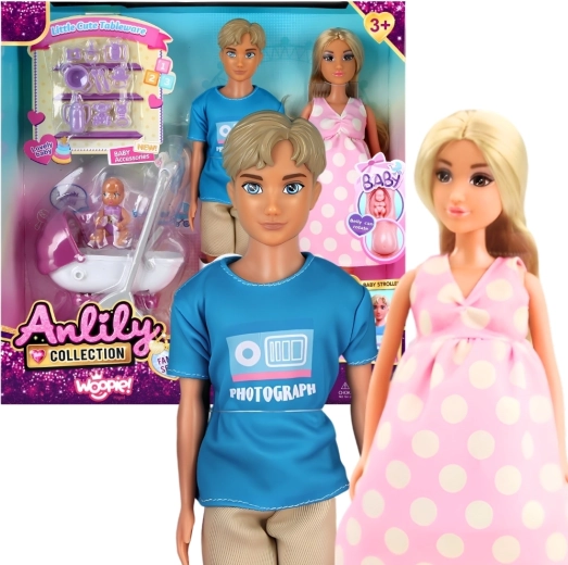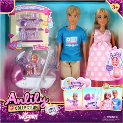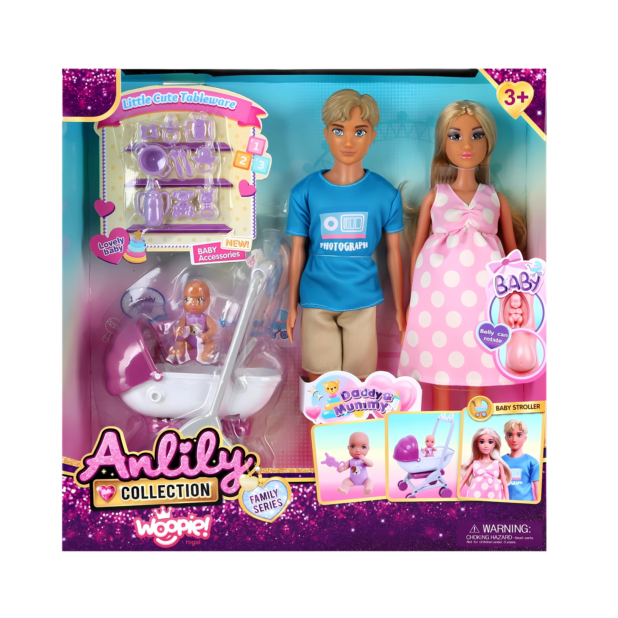 - Pregnant mom with removable baby, dad, baby, stroller, accessories (bottle, bowl, pacifier, diapers, comb, plate)